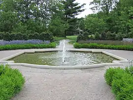 The Italian Garden is formally structured with a strong principal axis oriented north-south and draws its inspiration from famous Italian Renaissance gardens such as those at the Villa Medici in Rome, Villa d'Este in Tivoli, Villa Lante in Bagnaia, Villa Aldobrandini in Frascati, and Villa Farnese in Caprarola.[31] A view of a Rivers Purple Beech planted within the OAC '56 Park in The Garden is framed in the south opening of the sheared European beech hedge which encloses and defines the garden.[37] Nestled within this hedge are classical statues and garden benches. At the center of the garden is a formal pool with fountain jets, edged by pebble inlaid pavers. Between the central pool and the tall beech hedge, are a ring of boxwood-edged flowerbeds containing lavender and sage species, accented by four European hornbeams.[37] This garden's composition emphasizes balance and organized geometry.