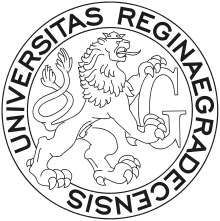 The Statutory emblem consists of a central crowned Czech lion,[10] looking heraldically left and holding in its forepaws a large letter "G". The figure also represents a part of the City of Hradec Králové emblem. In the circular inscription, the full title of the university is written in Latin.
