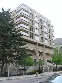 Components of the new School of Computing and Information are housed on the university's main campus in the Information Sciences Building, previously the primary home of the former School of Information Science. Originally the American Institutes for Research Building, the University purchased the 1965[23] Tasso Katselas designed Brutalist style structure [24] in 1968[25] and it has since then served as the primary facility housing the School of Information Sciences.[26] In 1975, a renovation was completed that enclosed the building's lower levels to create additional classrooms and offices.[27] An additional renovation to the building was completed in 2013, adding various upgrades including a computer lab, teleconference room, and a third floor Student Collaboration Center for study and work space.[28] Components of the school's Department of Computer Science are housed in Sennott Square. The building is home to the Nesbitt Room which houses several special collections on the history of children and children's books and media, rare editions of children's books, and some unique furnishings and artifacts.