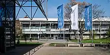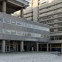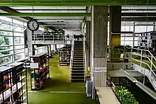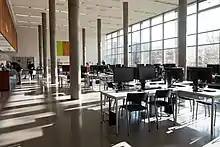 In 1961 the university was able to build a dedicated facility with the help of the Max-Kade-Foundation.[2] Planned and erected by the Stuttgart architectural firm Volkart und Zabel,[3][4] the building is modelled after American academic libraries. There are notable similiarities, for example, to the reading rooms of S. Price Gilbert Memorial Library[5] of the Georgia Institute of Technology.[6] Due to subsequent developments in library operations over the past 60 years, the library today faces significant space and structural problems. In 2018 the library building was added to the list of cultural heritage sites in the state of Baden-Württemberg.[7]