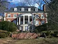 Also during this time fraternities began to purchase and construct houses. During the late 1800s fraternities did not have dedicated houses; instead, they inhabited residential areas scattered around grounds, such as Dawson's Row near the Lawn and boarding houses north of the university.[26][27] In 1908, the university's Board of Visitors first offered a land lease and a $12,000 loan to Kappa Sigma to construct a fraternity house, and many other fraternities followed.[25] Most of these were located just north of the Rotunda, on Rugby Road, Madison Lane, University Place, and the surrounding streets. Some of these houses cost up to $20,000 to build, and many drew inspiration from historic UVA buildings or residences of the Old South, using elements of Jeffersonian architecture.[25][28][29] Two houses were even styled to closely resemble famous buildings in the area, with Zeta Psi's house modeled after Monticello and Farmington, and Phi Kappa Psi's house modeled after Carr's Hill.[28][30][31] By 1916 most fraternities had built, purchased, or rented a house for their members.[25]