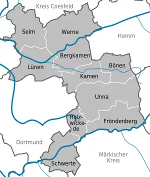 Geographically the district of Unna covers the area east of Dortmund, thus marking the east end of the Ruhrgebiet. Both the Ruhr and Lippe rivers flow through it.