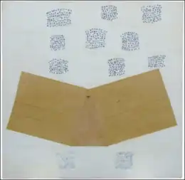 According to Gallagher, this mixed media artwork represents a minstrel show. It comprises a collection of pieces of paper adhered to a canvas like a collage, including two pieces of penmanship paper in the middle. Groups of eyes and red lips are lightly painted onto the pieces of paper. The viewer must get close to the artwork to see the faint lips and eyes.[1]