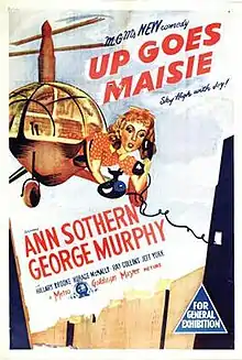 Up Goes Maisie is a 1946 American comedy film directed by Harry Beaumont. Produced by Metro-Goldwyn-Mayer, it is the ninth of 10 films starring Ann Sothern as ex-showgirl Maisie Ravier, characterized as "that double trouble doll with the sassy chassis." At nearly 40 years old, it was clear that both Sothern and the series was "winding down".[1] In this series entry, Maisie, "the peppery lady with a golden heart" goes to work for an inventor and helicopter operator played by George Murphy.[2]