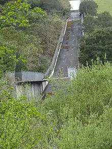 A new earth-filled dam was constructed in 1977, directly downstream of the old one, to provide protection against earthquakes.[6] The new dam is 182 feet (55 m) high and 1,300 feet (400 m) long, containing 88,890 cubic yards (67,960 m3) of material.[2]
