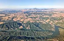 The reservoir was originally formed in 1926 when the first San Leandro Dam was completed, and it was first filled by the Mokelumne Aqueduct in 1929.[4] It inundated a long section of the San Leandro Creek valley, including the towns of Valle Vista and Redwood. The original dam was constructed between 1924 and 1926 using the hydraulic fill method and was considered seismically inadequate.[5]