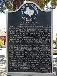 Uriah Lott was born January 30, 1842, in Albany, New York. In his early twenties he moved to Illinois for the Chicago and Alton Railroad. In 1867 he moved from Illinois to Corpus Christi where he found a passion and understanding for railway expansion. Before finding his new passion for railway expansion he owned a small store in Corpus Christi in 1867. He would later go on to work as a county clerk for a brief time as well as becoming a ranch supply salesman. He would go on to start another company of his own in 1869, U.Lott & Company. This company was a commission and forwarding company. After creating his own company his interests shifted to deep water ports. He was interested in securing one at Corpus Christi's port. On June 15, 1871, he joined the board of the Corpus Christi Navigation Company. His goal was to help improve the Corpus Christi ship channel.[1]