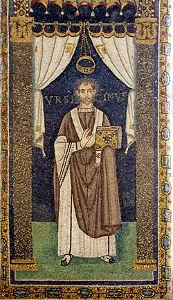 He is represented in the apse together with the bishops Severus, Ursus and Ecclesius. Above the bishops, represented all without nimbus, diadems are hanging between gathered vela (curtains). Ursicinus wears an alba (white dalmatic), a planeta and a pallium, an ecclesiastical vestment only worn by popes and archbishops. He wears special calcei on his feet, they too a garment reserved for the upper class. In his left hand he holds the holy scripture, represented as richly ornated codex. As customary in the ancient world, he does not touch the holy object with his bare hands, but covers them with his planeta. The representations date from the 6th century and are executed as portraits for the recent bishops Ecclesius and Ursicinus.[2]