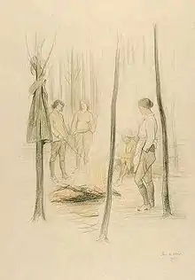 At the start of the First World War, Wood closed down her business and volunteered to join the Women's Forestry Corps, one of the three divisions of the Women's Land Army.[2] While working at a forestry camp in Wendover, Wood continued to paint and in January 1919 she contacted the Women's Work Committee of the Imperial War Museum. The Women's Work Committee had begun to collect artworks showing women's contribution to the war effort and so Wood offered them some of her sketches from Wendover. After much haggling over fees the Committee paid Wood 15 guineas for five sketches.[2][5]