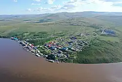 The settlement lies on the banks of the Belaya River (so called because of the contrast between its waters and those of the Anadyr[10]), near to where it flows into the Anadyr River.[11] The Parapol-Belsky Lowlands lie to the west and the Anadyr Lowlands to the east. The village is situated on the northern slopes of the mountain, Gynryretyk (Russian: Гынрырэтык, literally meaning "The Guardian").[10]
