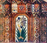 National traditions of wall painting, which is the most valuable legacy of Azerbaijani art, took the main place in the creativity of Usta Gambar Karabakhi. Chased decoration and richness of compositional and color resolutions can be seen in his delicate graphic painting of a complex plant ornament. The painter drew pictures of animals and fantastic beings upon branched ornaments of flowers and plants. The painting also didn't destroy flatness of the wall, but on the contrary, underlined its constructive architectural details.[7]