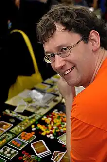 Since 2005, Rosenberg has concentrated mostly on complex economic strategy games,[3] often with a farming or fishing theme: his first, Agricola, was released in October 2007, went on to win a Spiel des Jahres special award for the best complex game of 2008,[4] and has become a staple in the European game subgenre of worker placement games. It dethroned Puerto Rico as the highest rated game on BoardGameGeek.com in September 2008 and stayed at the top of the rankings until March 2010.[4] A second game in this series, Le Havre, was published in October 2008, as well as Caverna in 2013.[4][5] His highest rated game is currently A Feast for Odin, which is ranked #23 on BoardGameGeek.com as of March 2023.[6]