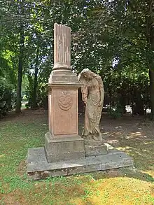 In 1836 Frierenberger's widow had a monument built on her husband's grave. In 1936, the memorial was relocated to the current town cemetery entrance (49°17′14″N 17°23′16″E / 49.2873333°N 17.3878333°E). The memorial in the Empire style is on the list of Cultural Monuments of the Czech Republic under the item number 101308.[8] The statue represents a grieving woman leaning on a pedestal which is carrying a broken Doric column. There are German inscriptions on all four sides of the pedestal shaft honoring the general.