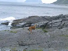 Norwegian Lundehund looking out at the ocean on the north side of the island Værøya. The island on the top, in the middle, is "Mosken"