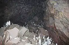 Víðgelmir (Icelandic pronunciation: [ˈviðˌcɛlmɪr̥]) is a lava tube situated in the Hallmundarhraun lava field (formed around 900 AD) in west Iceland, around 2 km southeast of Fljótstunga[1] farm in Hvítársíða, Borgarfjörður. The roof of the lava tube has collapsed, creating two large openings near its north end which are the only known entrances. Víðgelmir is 1585 m long and the largest part of the cave passage is 15.8 m high and 16.5 m wide, making it by far the largest of its kind in Iceland. The cave has a wide entrance but narrows down in some places. An iron gate was installed at the first constriction in 1991 to preserve those of the delicate lava formations or speleothems which hadn't already been destroyed. Evidence of human habitation, probably dating to the Viking Age, has been discovered in the cave and is preserved in the National Museum of Iceland. Long stretches of the cave floor are very rough and shouldn't be navigated without a guide. Access and guided tours are provided at nearby Fljótstunga.