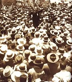 In January 1919, he joined the college commission that supported the workers' struggle for the establishment of the eight-hour labor reform. Contrary to popular belief, Haya de la Torre did not assume a leading role in the development of the strike, but rather played a small role as a student leader.[7] This episode marked the beginning of Haya's active participation in Peruvian politics. In October of that same year, he was elected president of the Peruvian Student Federation. He was linked with all sectors of society. He led movements in favor of university reform in Peru and labor organizations. He participated in the first National Student Congress, held in Cusco (March 1920), where the project to create the "popular universities" was approved,[8] which in 1922 took shape under the name of "González Prada", night schools for workers, which according to some historians formed the foundation for his party. He was instrumental in bringing the ideas of the Argentine University Reform movement (La Reforma) to San Marcos, and administrative reforms were instituted in 1919. Part of the reform movement was university extension programs, through which the university students hoped to reach the working classes.