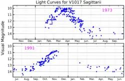 V1017 Sagittarii is a cataclysmic variable star system in the constellation Sagittarius. It first erupted in 1919, reaching magnitude 7. Its other eruptions in 1901, 1973 and 1991 only reached magnitude 10, leading it to be reclassified from a recurrent nova to a dwarf nova.[5]