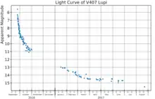V407 Lupi declined from its peak brightness very quickly, fading by 2 magnitudes in less than three days. That is one of the most rapid declines in brightness ever seen in a nova. It is therefore classified as a "very fast" nova in the classification scheme of Cecilia Payne-Gaposchkin.[7][8]