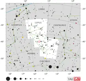 V407 Lupi, also known as Nova Lupi 2016, was a bright nova in the constellation Lupus discovered by All Sky Automated Survey for SuperNovae (ASAS-SN) on 24.00 September 2016. At the time of its discovery, it had an apparent visual magnitude of 9.1. The ASAS-SN team reported that no object at the nova's location brighter than magnitude 17.5 was seen on images taken four days earlier.[5] Wildly incorrect coordinates (in error by many degrees) were published in the announcement telegram,[5] but corrected in a subsequent telegram.[1] It reached a peak brightness of magnitude 5.6, faintly visible to the naked eye, on 25 September 2016.[6] [7]