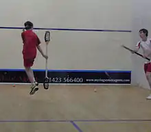 • V3 is also a singles version played on a squash court, however it is played by three players using four balls. V3 is played on the basis of ‘every man for himself.’ The winner is the player who concedes the fewest points. A game lasts for two halves of four minutes each.