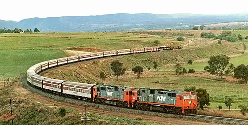 On 1 November 1997, the remaining passenger services operated by Australian National were sold to Great Southern Rail (GSR).[15] The sale included the standard gauge Overland passenger fleet – two roomette, four twinette sleepers; three first-class and six second-class sitting cars, three composite second-class sitting with buffet cars and two club cars. Power van PCO4 was also included in the sale, but at the time it was on broad gauge for the short-lived Explorer train, in a dark blue livery with wide yellow bands. It was converted to standard gauge in 1998 and given quick coat of grey paint.[16][17]