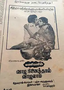 Vaazha Ninaithaal Vaazhalaam (transl.You can live if you want to live) is a 1978 Indian Tamil-language film romantic drama film directed by Devaraj–Mohan and written by Panchu Arunachalam from a story by Manian. The film stars Jaishankar, Sripriya and Jayadevi, with Major Sundarrajan, Thengai Srinivasan, I. S. R., Ennathe Kannaiah, Manorama, S. N. Lakshmi and Typist Gopu in supporting roles. It was released on 14 January 1978.