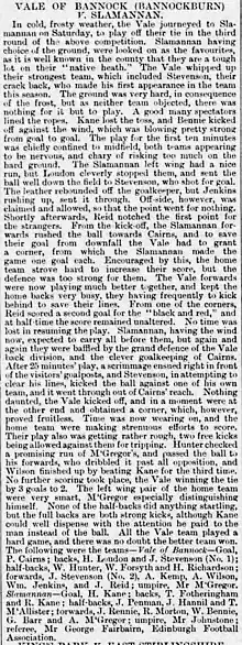 The club's best run in the Stirlingshire Cup 1887–88; the Vale was 2–1 up against Campsie in its first tie in 1883–84 with half-an-hour remaining when Campsie walked off due to the "hopeless" weather of a "perfect gale of wind and sleet",[7] and Campsie won the replay. In 1887–88, the club went on a remarkable run to the semi-final, winning 5–3 at Redding Athletic[8] and 3–2 against Slamannan en route. The win at tiny Redding was somewhat Pyrrhic, as not only did the minuscule gate (of no more than 30) mean that there was no gate money for the Vale to share, but the Vale was even forced to pay a penny towards the refereeing expenses.[9]