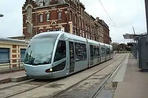 The Valenciennes tramway (French: tramway de Valenciennes) is a tram system serving Valenciennes and part of its surrounding areas, in the Nord department of France. Since 2014 the network has consisted of two lines with a total of 33.8 mi (54.4 km) of track and 48 stations.