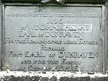 He was created Baron Adare on 31 July 1800 – as a staunch supporter of the political union, he was recommended by Lord Cornwallis [2] – Viscount Mount-Earl on 3 February 1816, and Earl of Dunraven and Mount-Earl on 5 February 1822, all titles in the Peerage of Ireland. He presumably chose the title of Dunraven in honour of his daughter-in-law, the heiress Caroline Wyndham of Dunraven Castle, who had married his eldest son in 1810. His earldom lasted only two years until his death in 1824, when his son, Windham Henry Quin, became the 2nd Earl of Dunraven and Mount-Earl. The family name had officially become Wyndham-Quin in 1815.[3]
