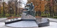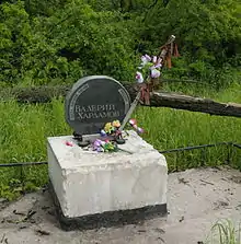 Kharlamov was still active with CSKA when he was killed in a car accident on 27 August 1981.[16] Prior to the accident, Kharlamov had been informed that he would not be a member of the Soviet team playing in the 1981 Canada Cup.[20] Coach Viktor Tikhonov said that Kharlamov was left off the team over concerns about his conditioning.[3] Irina, Kharlamov's wife, was driving back to Moscow from the family's cottage when she lost control and crossed into opposing traffic, hitting a truck head-on.[2] Irina did not have a driver's license at the time of the crash. When the bodies were recovered, Kharlamov was reaching over from his seat, holding onto the steering wheel.[3] Irina's cousin was also killed.[2] Fans lined the streets during his funeral procession in Moscow, and they filed past his casket which rested at centre ice of CSKA's arena.[3] Near the scene of the crash, a memorial stone in the shape of a hockey puck is inscribed, "The star of Russian hockey fell here."[16]
