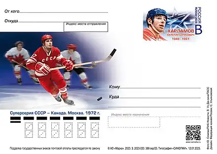 Valeri Borisovich Kharlamov (Russian: Вале́рий Бори́сович Харла́мов, IPA: [vɐˈlʲerʲɪj bɐˈrʲisəvʲɪtɕ xɐrˈlaməf]; 14 January 1948 – 27 August 1981) was a Russian ice hockey forward who played for CSKA Moscow in the Soviet League from 1967 until his death in 1981. Although small in stature, Kharlamov was a speedy, intelligent, skilled and dominant player, being named the Soviet Championship League most valuable player in 1972 and 1973. An offensive player, who was considered very creative on the ice, he also led the league in scoring in 1972. He was also a gifted skater who was able to make plays at top speed. Kharlamov was considered one of the best players of his era, as well as one of the greatest players of all time.
