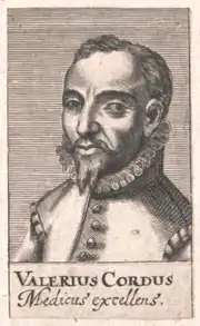 Valerius Cordus (18 February 1515 – 25 September 1544) was a German physician, botanist and pharmacologist who authored the first pharmacopoeia North of the Alps and one of the most celebrated herbals in history. He is also widely credited with developing a method for synthesizing ether (which he called by the Latin name oleum dulci vitrioli, or "sweet oil of vitriol").