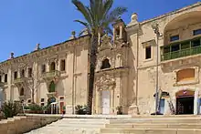 The Valletta Waterfront, is a promenade in Floriana,[1] Malta, mainly featuring three prominent buildings: a church in the middle, the Pinto Stores or the Pinto Wharf on the left, and the Forni Stores or the Forni Shopping Complex on the right. The buildings were originally stores and warehouses, built in the 18th century, and the design is attributed to Andrea Belli.