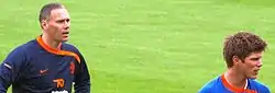 Van Basten had a contract with the KNVB for managing the Dutch national side until 2008. The KNVB had expressed its wishes to extend his contract to include the World Cup qualification route to 2010 World Cup in South Africa. On 22 February 2008, Van Basten signed a four-year contract with Ajax, starting from 1 July.[71] His last tournament thus was the UEFA Euro 2008, where the Netherlands surprised with a strong first round performance. They beat world champions Italy 3–0 in their first match,[72] followed by a 4–1 win over World Cup runners-up France.[73] In their third match, having already qualified for the next round, Van Basten selected non-regulars such as Maarten Stekelenburg, Wilfred Bouma and Ibrahim Afellay for the starting lineup against Romania, a match the Oranje won 2–0.[74] In the quarter-finals, Van Basten faced fellow Dutchman Guus Hiddink's Russia. With the score at 1–1 after 90 minutes, Hiddink and Russia went on to win the match 3–1 in extra-time.[75] He finished his reign with a record of 35 wins, 11 draws and six losses in 52 matches.[76]
