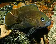 Variabilichromis moorii has no common name and is a species of freshwater cichlid endemic to Lake Tanganyika in eastern Africa. It is a small ovate bodied fish named for an early collector of fish from the lake, John Edmund Sharrock Moore (1870-1947) who was a cytologist, zoologist and led an expedition to Lake Tanganyika and who discovered this species.[2] Juveniles are usually yellow, and adults are dark brown to black in color.[3] It reaches a total length (TL) of 10.3 centimetres (4.1 in). Currently it is the only member of its genus. V. moorii feeds on algae, zooplankton, and benthic invertebrates. It is also found in the aquarium trade.[4]