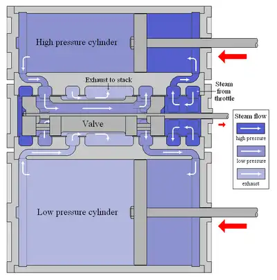 The key to the Vauclain compound is its valve system. In essence, there is an extra system of valves, concentric with the usual middle steam passage in conventional single expansion piston valves.[3] This passage connects the high-pressure cylinder exhaust to the low-pressure cylinder intake. The driving pistons are rigidly connected to either side of the crosshead, so that they move in concert. As high-pressure steam is admitted to one side of the high-pressure cylinder, the low-pressure steam exhausted from the other side is passed through the valves to the opposite side of the engine and into the low-pressure cylinder; finally the exhaust steam from the opposite side of the low-pressure cylinder escapes through the center part of the valve to the blastpipe.[4]
