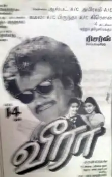 Veera (transl.Valour)[lower-alpha 1] is a 1994 Indian Tamil-language romantic comedy film[2] directed by Suresh Krissna and written by Panchu Arunachalam. It is a remake of the Telugu film Allari Mogudu (1992) and stars Rajinikanth, Meena and Roja with Janagaraj, Senthil, Vadivukkarasi, J. Livingston, Mahesh Anand, Vinu Chakravarthy, Ajay Rathnam, Vivek and Charuhasan in supporting roles. The film is about a man who marries twice because of circumstances beyond his control and is forced to live a double life to cover his tracks.