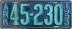 1945 | Embossed golden yellow serial on black plate with border line; "19 ARK. 45" centered at top | none | 123-456 | 1 to approximately 218-000 | |