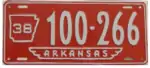 1938 | Embossed white serial on red plate with border line; "ARKANSAS" within winged graphic centered at bottom; "38" within state outline at left | none | 123-456 | 1 to approximately 177-000 | |