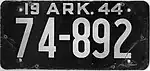 1944 | White serial on black fiberboard plate; "19 ARK. 44" centered at top | none | 123-456 | 1 to approximately 224-000 | Manufactured on fiberboard due to ongoing metal conservation for World War II. |
