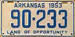 1953 | Embossed blue serial on white plate with border line; "ARKANSAS 1953" centered at top | "LAND OF OPPORTUNITY" at bottom | 123-456 | 1 to approximately 394-000 | |