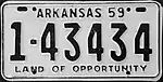 1959 | Embossed black serial on white plate with border line; "ARKANSAS 59" centered at top | "LAND OF OPPORTUNITY" at bottom | 1-12345 10-12345 |