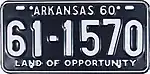 1960 | Embossed white serial on dark blue plate with border line; "ARKANSAS 60" centered at top | "LAND OF OPPORTUNITY" at bottom | 1-12345 10-12345 |