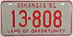 1961 | Embossed red serial on gray plate with border line; "ARKANSAS 61" centered at top | "LAND OF OPPORTUNITY" at bottom | 1-12345 10-12345 |