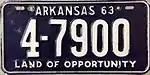 1963 | Embossed white serial on dark blue plate with border line; "ARKANSAS 63" centered at top | "LAND OF OPPORTUNITY" at bottom | 1-123456 10-12345 |