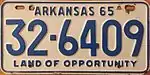 1965 | Embossed blue serial on white plate with border line; "ARKANSAS 65" centered at top | "LAND OF OPPORTUNITY" at bottom | 1-123456 10-12345 |