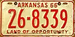 1966 | Embossed red serial on reflective white plate with border line; "ARKANSAS 66" centered at top | "LAND OF OPPORTUNITY" at bottom | 1-123456 10-12345 |