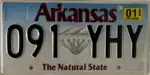 Embossed black serial on reflective gradient sky blue and white plate; diamond graphic screened in the center; "Arkansas" screened in dark red centered at top | "The Natural State" screened in dark red centered at bottom | 123 ABC | 001 KPG to 999 ZZZ | Letters U and V added back to serials in 2015.[2] |