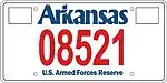 Veteran | obsolete | Embossed red on reflective white; "Arkansas" screened in blue at top; campaign name sticker at bottom; sticker at left for corresponding branch of service, medal, or major award | U/S ABCDE | U/S AAAAA to approximately U/S AIAZZ | Issued to veterans of World War II, the Korean, Vietnam and Persian Gulf Wars, and Operations Iraqi Freedom and Enduring Freedom. Discontinued in favour of regular passenger plates with campaign name sticker placed over the "Natural State" slogan, but still valid. |