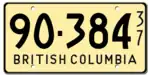 1937 | Embossed black serial on cream plate with border line; "BRITISH COLUMBIA" at bottom and vertical "37" at right | none | 12-345 | 1 to approximately 91-000 | |